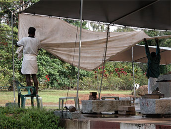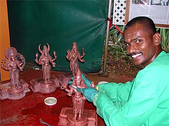 Gurudeva presides over his work. The final job is done by hand with a wire brush.