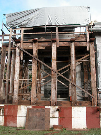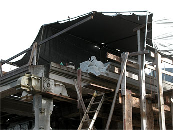 Today the team is focused on the roof level, working around one of the six crocodile rain water spouts which you can see at the center of this photo.