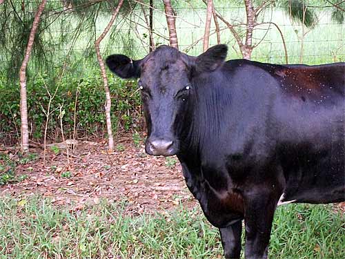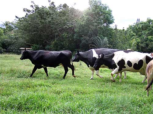 Our new cow arrived today. She is from the Big Island and is mostly black. So we named her after the Goddess of Fire, Pele. Pele is on the front being followed by the local cow residents of the monastery. She goes through a period of adjustment as the newbie in the pasture.
