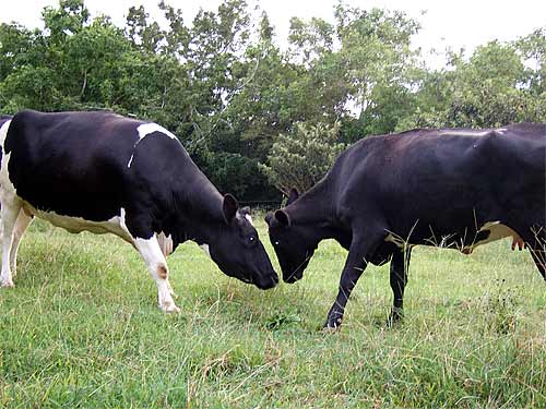 Here Pele faces off with Mimi who is a much bigger cow. Pele made it clear that she was not going to be pushed around and proceeded to do a little pushing herself. This is the way cows get acquainted.