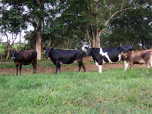 After a few minutes of introduction, the cows posed for this shot. It wasn't easy getting them in this order. On the left is Nandini, daughter of Hanna. Next is Pele, the Great Fire Goddess from the Big Island. The big Holstein is Mimi, also daughter of Hanna. On the right is Anu, daughter of Chaturthi.