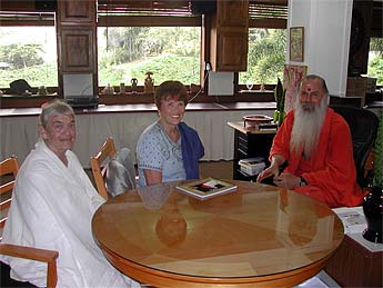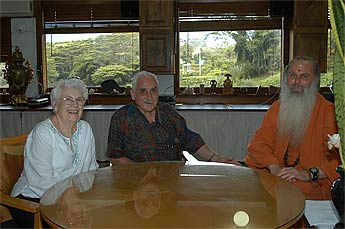 Two days back Lucy Kauaihalau visited with her mom and dad and sister, Janine. Here Jacque and Lucille spend a few moments with Palaniswami after their tour of the temple. They have been coming for six years and tell us of their joy in seeing the progress.