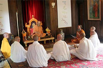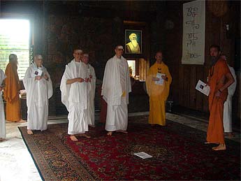 Acharya Kumarswami conducts the ceremony as they all in unison speak out their solemn pledge to follow the sacred vows of the Saiva monastic: Humility, Purity, Obedience and Confidence