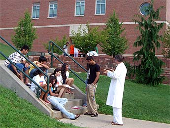 Easan and his son Kartikeya are teaching at the annual summer camp held by the Pittsburg temple in Pennsylvania. We hope to get more news and photos later. Here he talks to a group outside during a break.