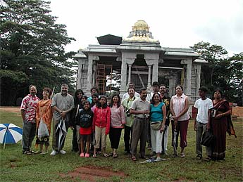 A light rain had begun to fall as we entered the temple site. Here is another group photo near the east-facing Gopuram. Everyone then had an opportunity to see all the wonderful stonework up close, ask questions, and talk to the silpis.