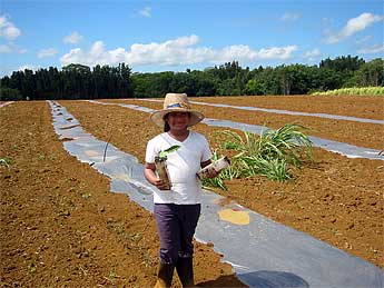 Dipanjali with a noni tree in a square tube, 2 inches by 2 inches by 8 inches. The trees were grown from seedlings in these open-bottom cardboard collars, which "air prune" the roots. As the roots grow down and hit air, they simply stop growing, unlike in a pot where they'll tend to wrap around the bottom of the pot. When the trees are taken out of these collars, they transplant easily with little shock.