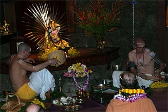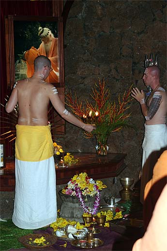 Sadhaka Jivanandanatha and Sadhaka Nilakantha perform the puja.