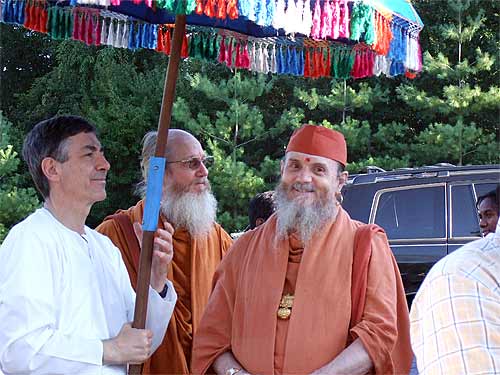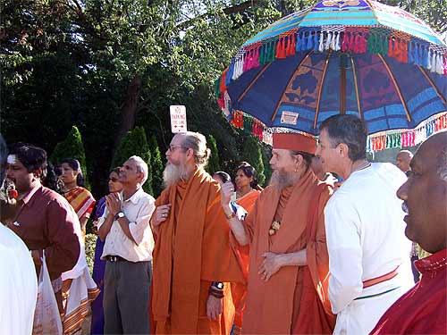 The morning activities ended with the main arati inside the temple. Prasadam was served downstairs for everyone to enjoy. In the afternoon the two swamis waited with the children outside for the start of the pradakshina around the temple.