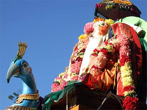 Mayil is happy to give Lord Murugan a ride around the temple. Here he is keeping an eye on the camera.
