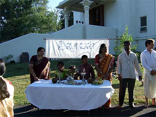 Around the temple were tables representing the six temples of Lord Murugan in South India. At each table the priests would break a few coconuts. The final stop was a table representing "Iraivan."
