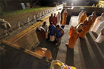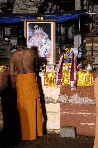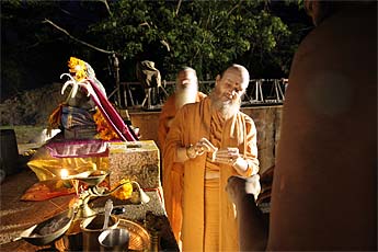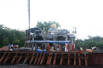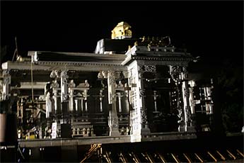 Giant lights are in place for the work to begin before dawn at Iraivan.