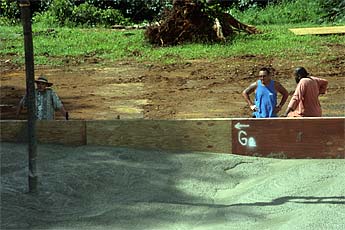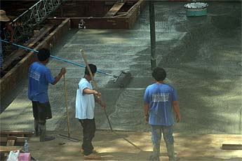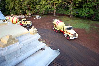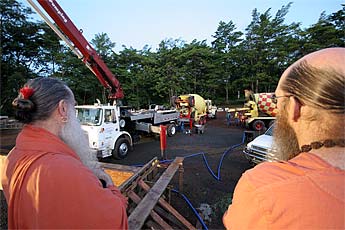 Nearly halfway now, two feet of concrete is in. Yoginathaswami chats with Craig. Months of planning and work by the Siddhidata Kulam come to fruition today.