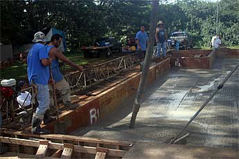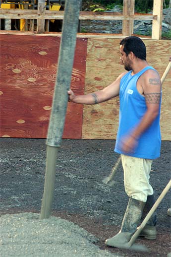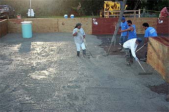 More pictures tomorrow. As the morning continues, the rain arrived. Fortunately the pour was virtually complete and a little water on top of the slab was not a big problem.