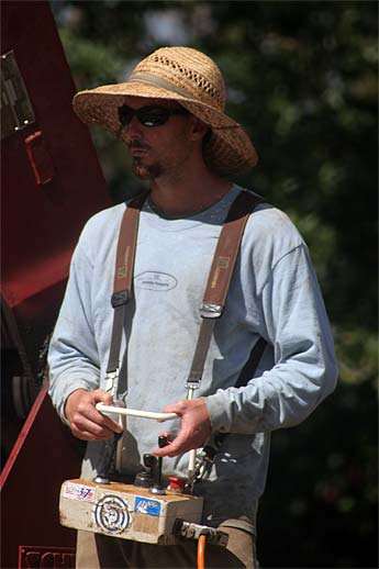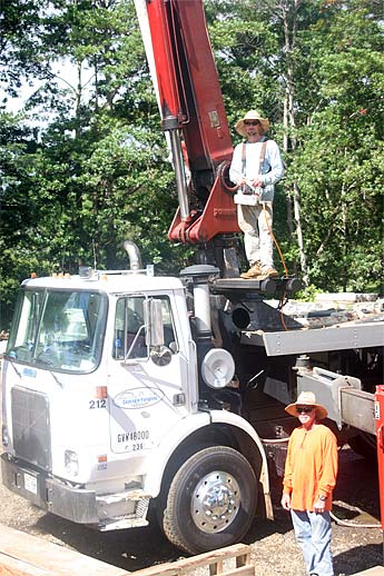 And the pour begins! Craig Kawakami guides the boom, carefully placing concrete in a steady pattern cover the entire area, layer by layer. Here he starts in the auspicious Northeast corner.