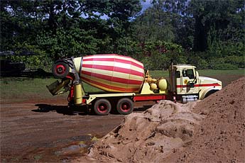 The sun has risen in the east; the boom pump truck is in place and the first load of concrete goes into the hopper.