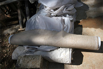 Burlap on hand to throw over the slab to keep it cool. Temperature checks this morning: the slab is "cooking" at a 110 degrees fahrenheit, as the cement undergoes it's chemical reactions, which is cool enough.