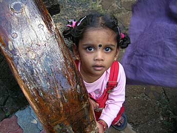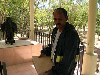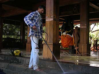 With the large numbers of visitors coming a lot of dirt has accumulated in the very porous lava rock steps leading into the Mandapam. Kumaren is taking good care now removing the dirt...
