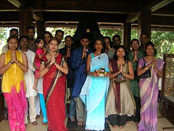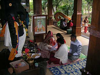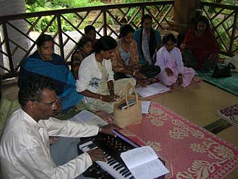 Inside the Mandapam a group of sishyas led by Parmeswaran Ramsamy and Nanda Thungavellu are rehearsing Ganesha bhajans that will be sung during the ceremony.