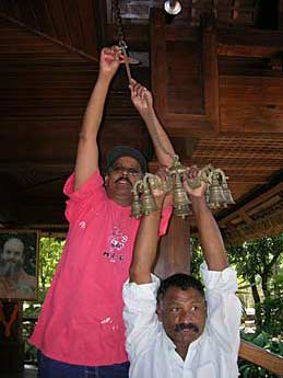 Karma yoga continues with the removal of the main brass bells at the entrance of the Ganesha Mandapam by Paramasiven and Somandiren.