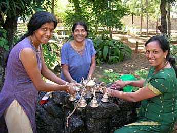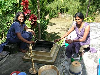 Premila and Maghadevi are cleaning the brass homa pit and other items near the swimming pool area...