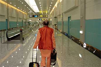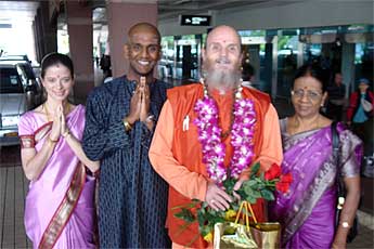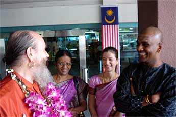 Sivaram Eeswaran, Devika and Sivaram's mother, greeting Bodhinatha at the airport in Penang.