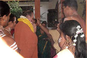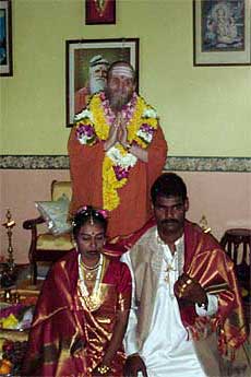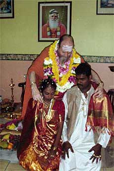 Bodhinatha wraps a shawl around newlyweds Taraman and Marri.