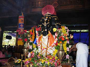 Here is the worship of Lord Ganesha through water, lights, flowers, fruits and sweets offered by devotees..