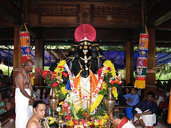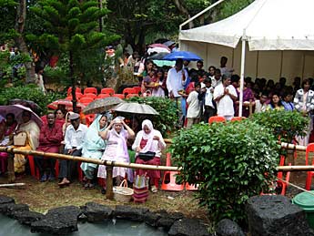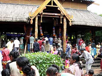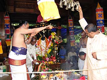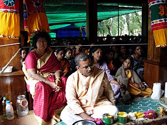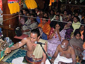 The Mandapam is full with devotees barely leaving any walking space. Tents have been erected on two sides where devotees comfortably seated can follow the puja. Tents have also been erected in front the building to cater for the large numbers of devotees.