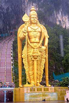 As we left the ashram, it was pouring down rain. Still we made a brief visit to the Batu Caves compound at the base of the sacred hill to gaze upon the newly completed, 100 or so foot tall golden statue of Lord Murugan, and even got a photo to capture the moment.