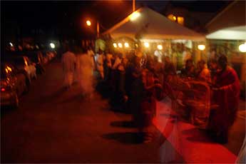 The main event of the day was the mission satsang at Kulapati Selladurai's home. Here is an artistic shot of Bodhinatha's entering the compound.