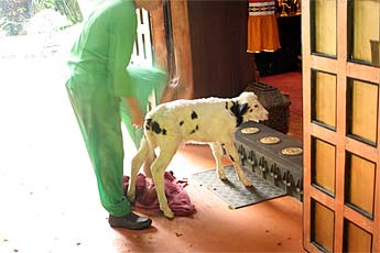 A very beautiful white coat, with black spots. The monks bring her to the temple for a blessing.
