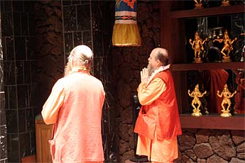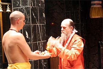 He and Arumugaswami go to the temple for arati on arrival.