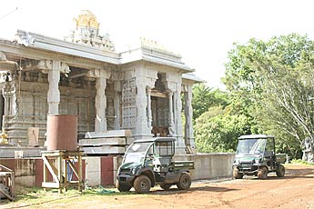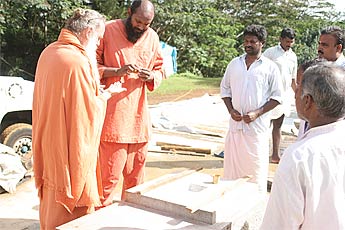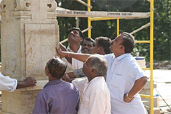 Later in the morning, Selvanathan Sthapati and Yoginathaswami on top of the temple looking for places where more ornamentation work can be done.