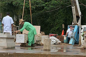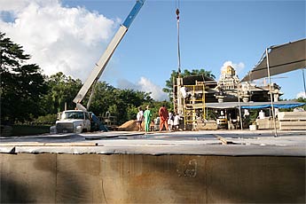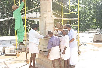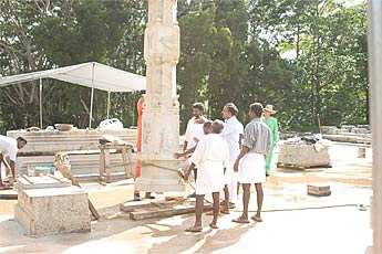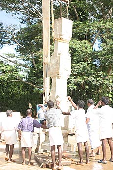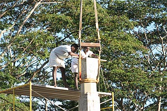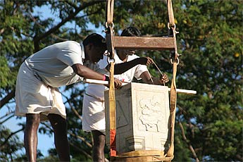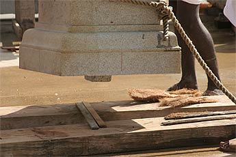 All the carvers join to guide the heavy pillar to the exact spot.
