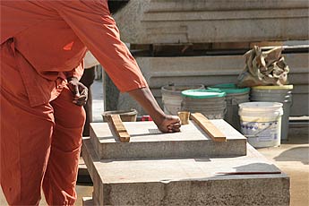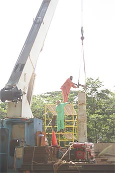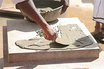 Then a thin layer of mortar before the pillar is lifted.