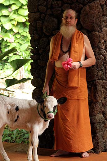 Our new little calf, Deepti, is brought over by Shanmuganathaswami to greet our arriving Satguru.