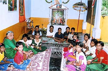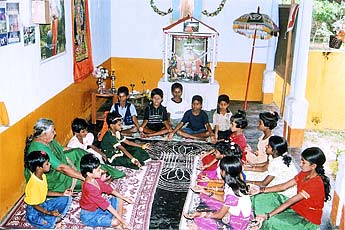 This is a photo taken, in July, of the meditation class conducted at the Sri Subramuniya Kottam. The class is held every Friday evening. Kulamata Sivalosani Kanagaratnam conducts a guided meditation that the children follow. The session starts with a group bhajan.