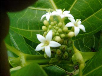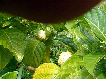 Our new plantation is being managed according to strict organic standards. A local distributor and processor of noni products has successfully opened up distribution channels in over 100 outlets on the mainland and says he can use all the organically grown noni that we can possibly grow! Here are healthy flowers that will soon be big fat fruits.