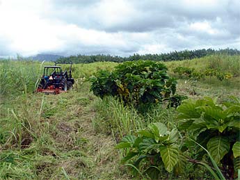 We are learning a lot about what it is like for farmers who want to work with nature but must also deal with the challenges of nature. One major challenge here in Hawaii, is Guinea Grass, a tall, aggressive, very tough grass that takes over large areas and has stems as thick as your fingers and hard as bamboo. Since we are "going organic" on this section of the land, we do not use any herbicides... The grass must be managed by mowing, weed-wackers and hand weeding.