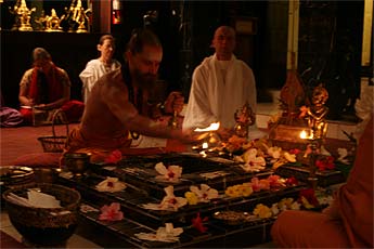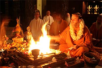 Many prayers from devotees around the world are offered to the homa fire.