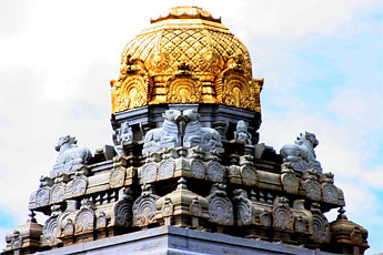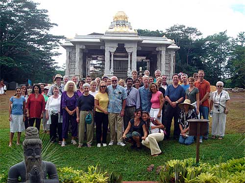 This is the grand image we see when gazing at Iraivan's resplendence from afar. This white granite sanctuary seems to beam brilliantly like a mighty pearl in the powerful Kauaian sun.
