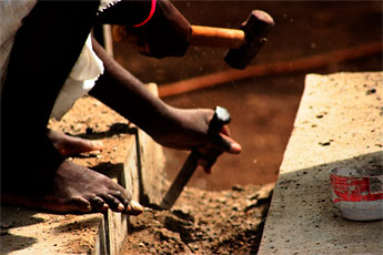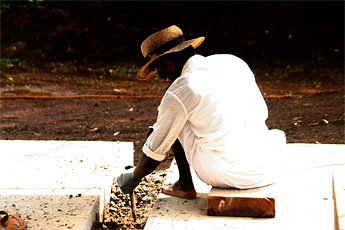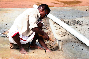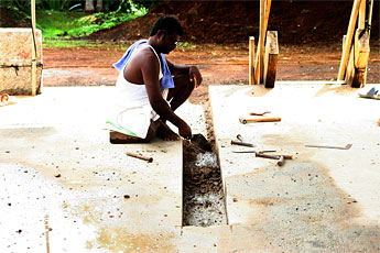 All of the concrete waste accumulated by this process must be dealt with as the work goes along. Here, we see how the silpis scrape away the excess matter.