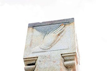 A prayerful moment. Here we see a motif atop one of Iraivan's pillars set against a bright sky. The act of folding the hands in worshipful respect (anjali mudra) is practiced throughout many cultures and in many eras. This truly shows the innate unity of all jivas as Siva on the path to merger.