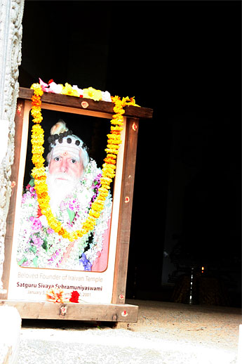 Our beloved Gurudeva encouraged us to go deep within ourselves, where we are to find the Self. Here, Gurudeva (whose photo adorns the entry to the sanctum so all may look into the eyes of the founder) seems to be urging us inward to the lofty realms of our own being - shown here by the barely-visable sanctum sanctorum.