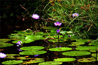 Gurudeva often likened the soul's maturation to that of a lotus. In the beginning, as young souls, we reside in the murky depths of our own egoity and fearfulness, like the mud beneath a pond. Later, as we grow, the leave the muck and mire behind to enter the more lucid realm of the reason and higher emotions, similar to water - yet still hidden from the light. Finally, as we become ripened, old souls, we break through all barriers. We get our first breaths of Life, shine flawlessly in the light, and wonder why we didn't realize this before. Botanists visiting us today will quibble that these are water lilies, and they are right!