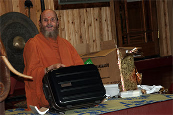 Bodhinatha's birthday will be next week when he is traveling so the monks are giving their gifts to him early. He was invited to open them at lunch since we secretely knew they would be useful for the journey he is about to make.