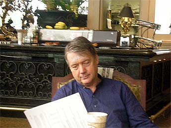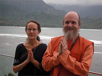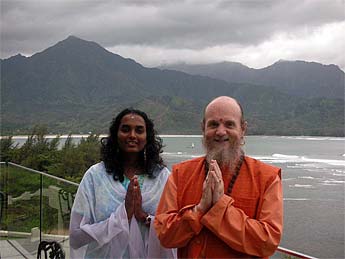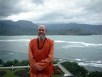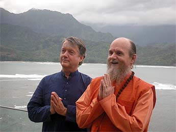 A few feet from our table, Bodhinatha stands with Hanalei Bay behind him.