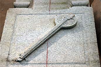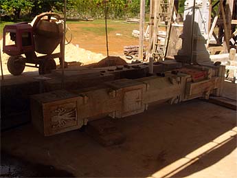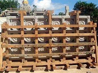 Pillars arrive as well. This one has a carving of the Simhasanam in the Guru Peedam, the spiritual seat of authority for the Kailasa Paramparai.