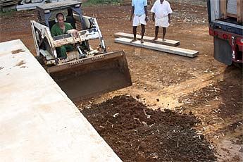 The big news was the arrival of containers. These pictures taken yesteraday afternoon. Yoginathaswami inspects the area. It looks like the ground is a bit too low and the edge of the container will not meet the edge of the concrete slab.