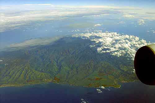 Our flight to Japan took us right past Kauai, so we got this unusual picture of nearly the entire island. It is evident from the air how much of Kauai is inaccessible wilderness area, nearly the entire central part of the island.